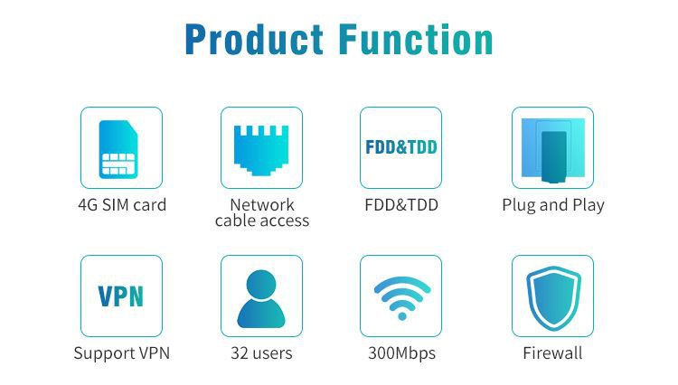 यह एक CAT 4 4G वाईफाई रूटर ट्रांसमिशन स्पीड 300Mbps तक है, 150Mbps तक 4G गति, TDD-LTE: 150Mbps DL / 50Mbps UL TD-SCDMA: 2.8Mbps DL / 2.2Mbps UL। टर्मिनल तीन संचार मोड का समर्थन कर सकता है: टीडीडी एफडीडी, डब्ल्यूसीडीएमए। यह इंटरनेट एक्सेस / PPPoE कार्य मोड का समर्थन करता है, 4 जी सिम कार्ड का उपयोग करता है, गेटवे मोड के रूप में मॉडेम के काम से कनेक्ट कर सकता है, 4 लैन इंटरफ़ेस से सुसज्जित है, एक साथ अन्य उपकरणों से कनेक्ट हो सकता है। यह कनेक्ट करने के लिए आसान है और हाथ में ले जाने के लिए आसान है 32 वाईफ़ाई उपयोगकर्ताओं के लिए ग्राहक साझा करना, बस सिम कार्ड डालें, तो इस पोर्टेबल 4 जी एलटीई रूटर के साथ वाईफाई का आनंद ले सकते हैं।